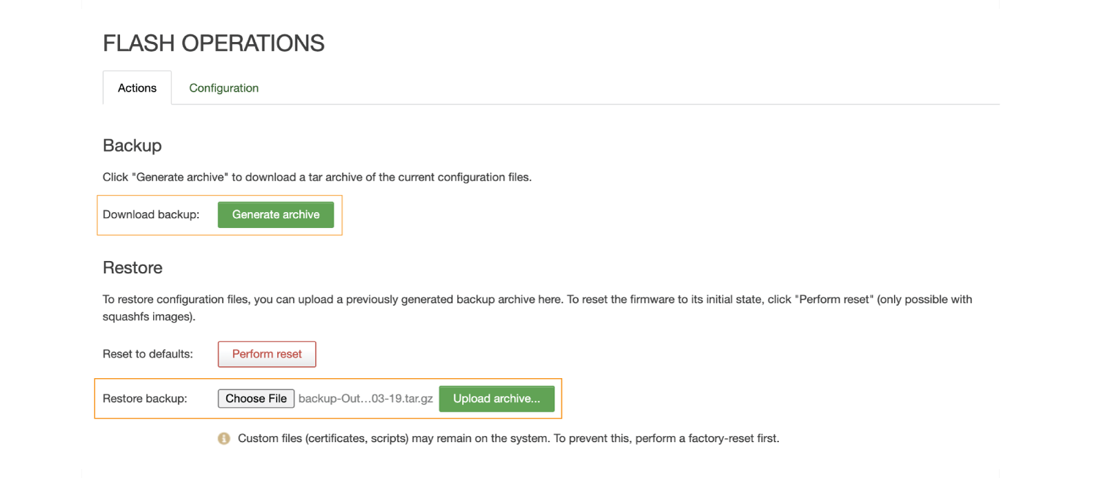 Enabling the "Keep settings..." checkbox will run a standard upgrade that preserves current configurations, such as network and Wi-Fi settings, the device hostname, etc. The "Online Upgrade" option will automatically keep current settings.