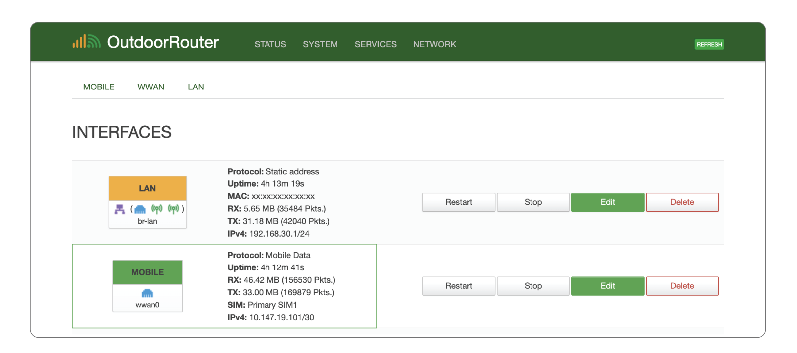 Go to "Network > Interface" to go to the interface overview page. Locate the Mobile (wwan0) on the second row. It shows the information below.