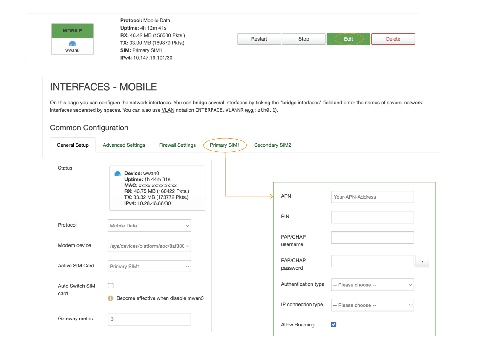 Go to "Network > Interfaces > Mobile" and click the "Edit" button on the Mobile interface.