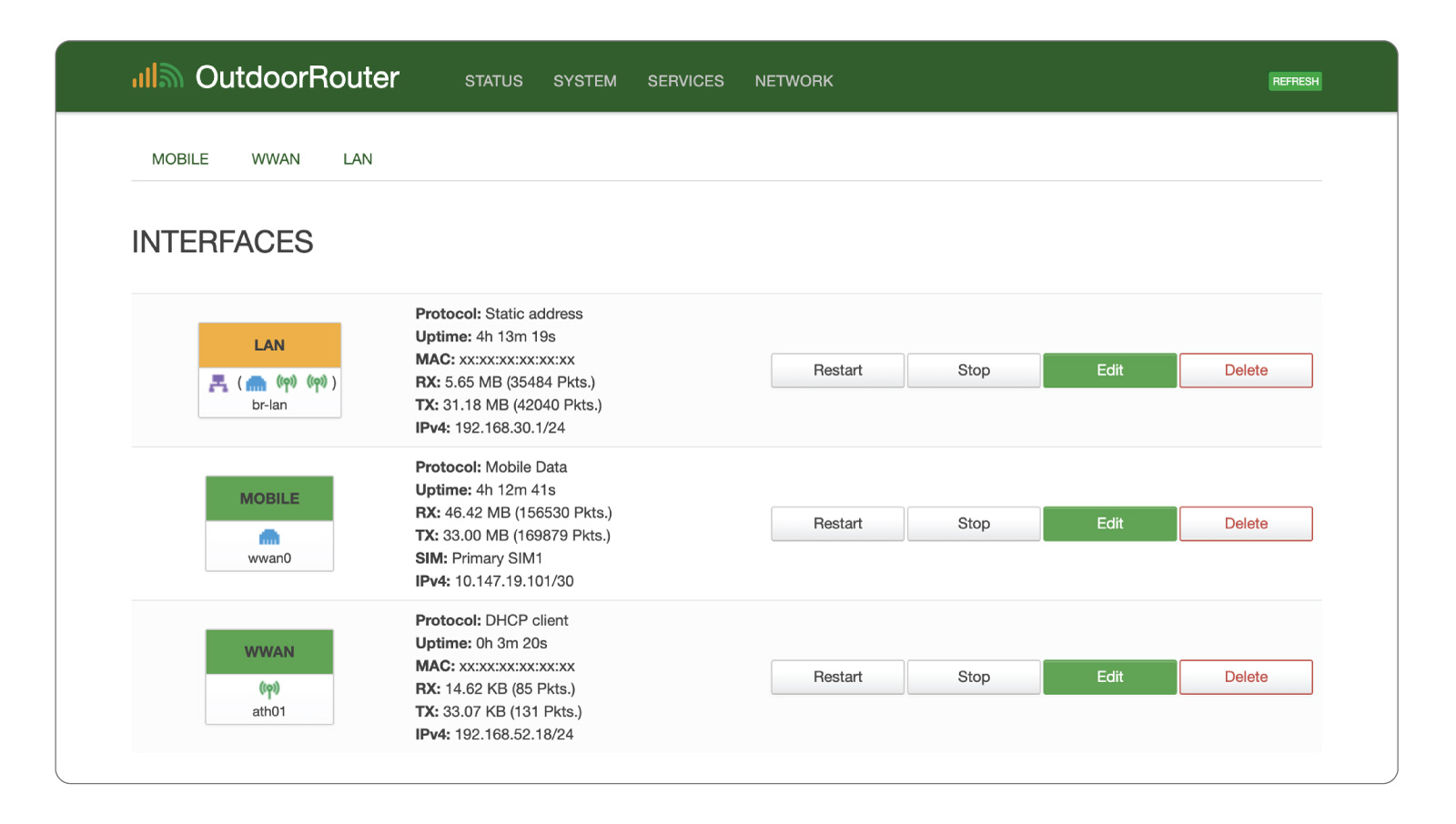 This is the leading local intranet network interface assigned to the physical RJ45 LAN & PoE port and logical Wi-Fi hotspots. To configure the local intranet networks, refer to the section below.