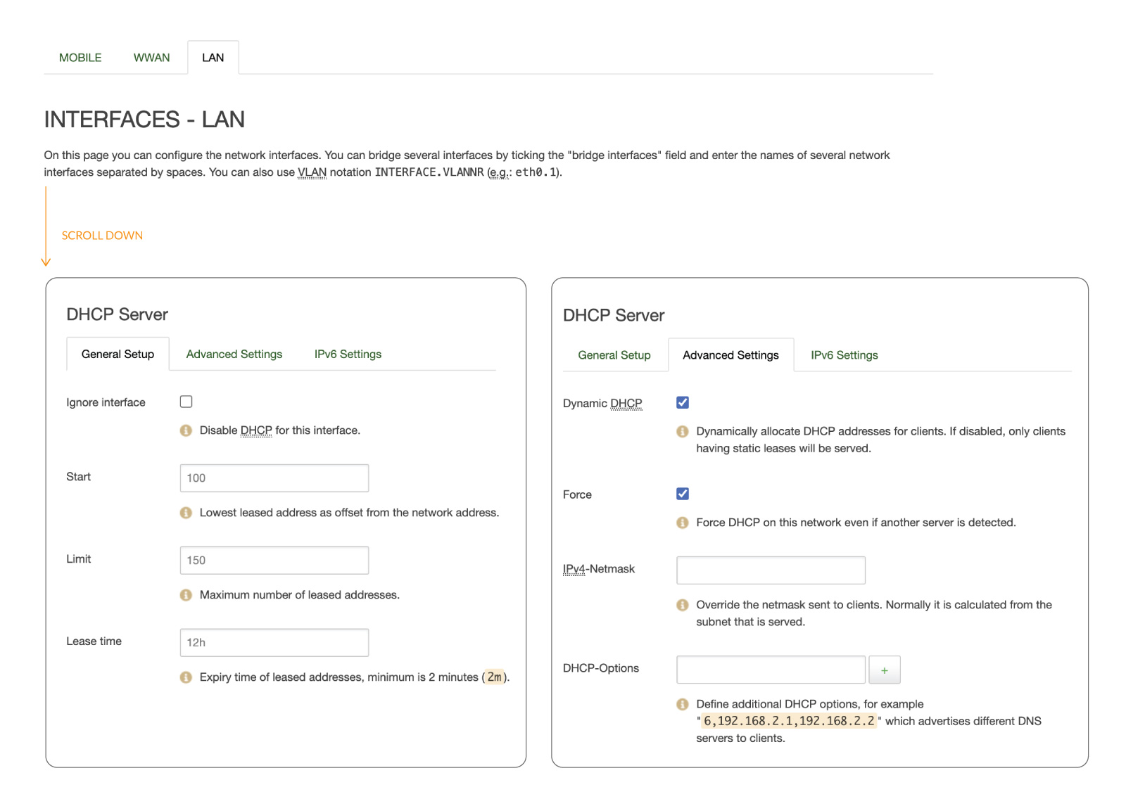 For example, you can assign an MTU value per DHCP with "26,1470" or "option:mtu, 1470". You can add more options by clicking the plus symbol next to the field.